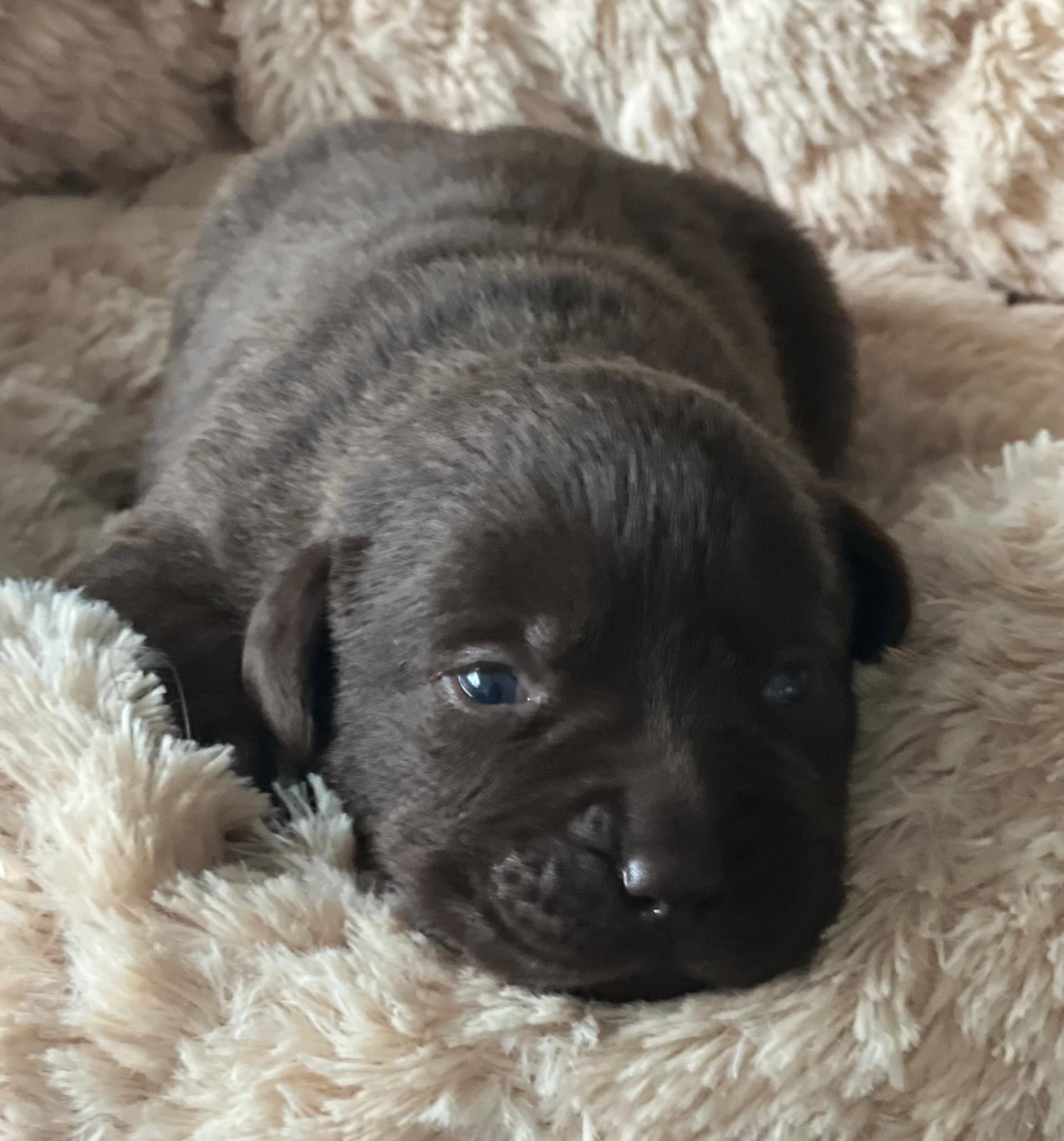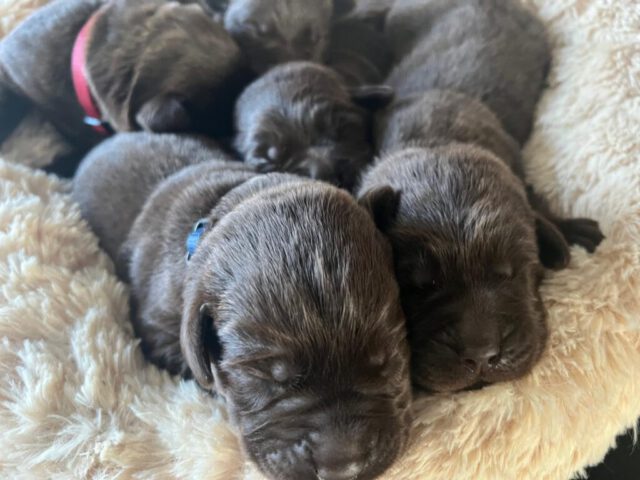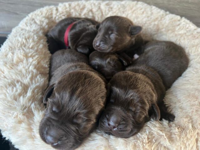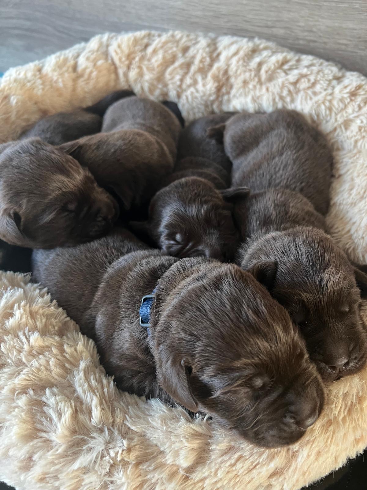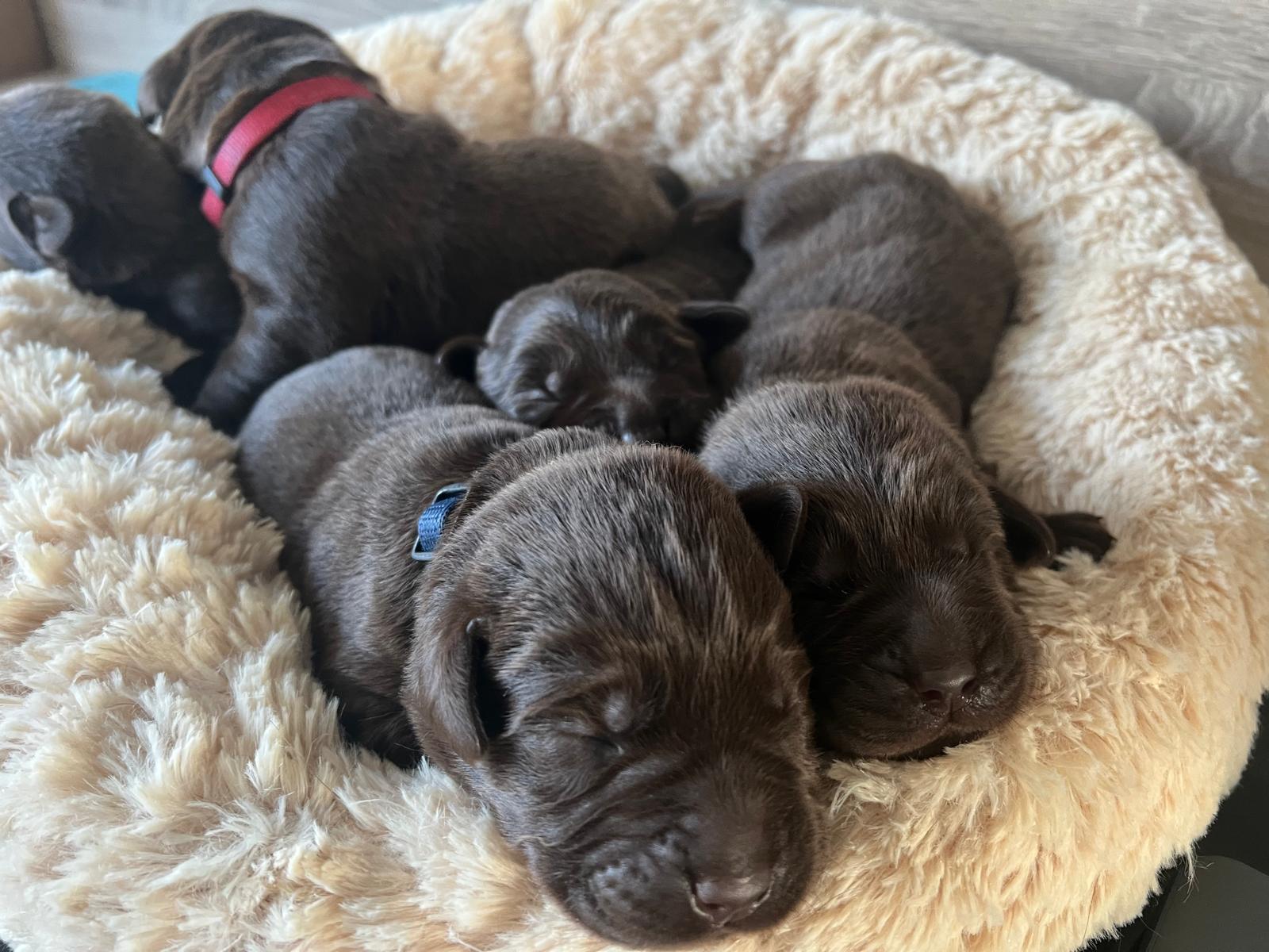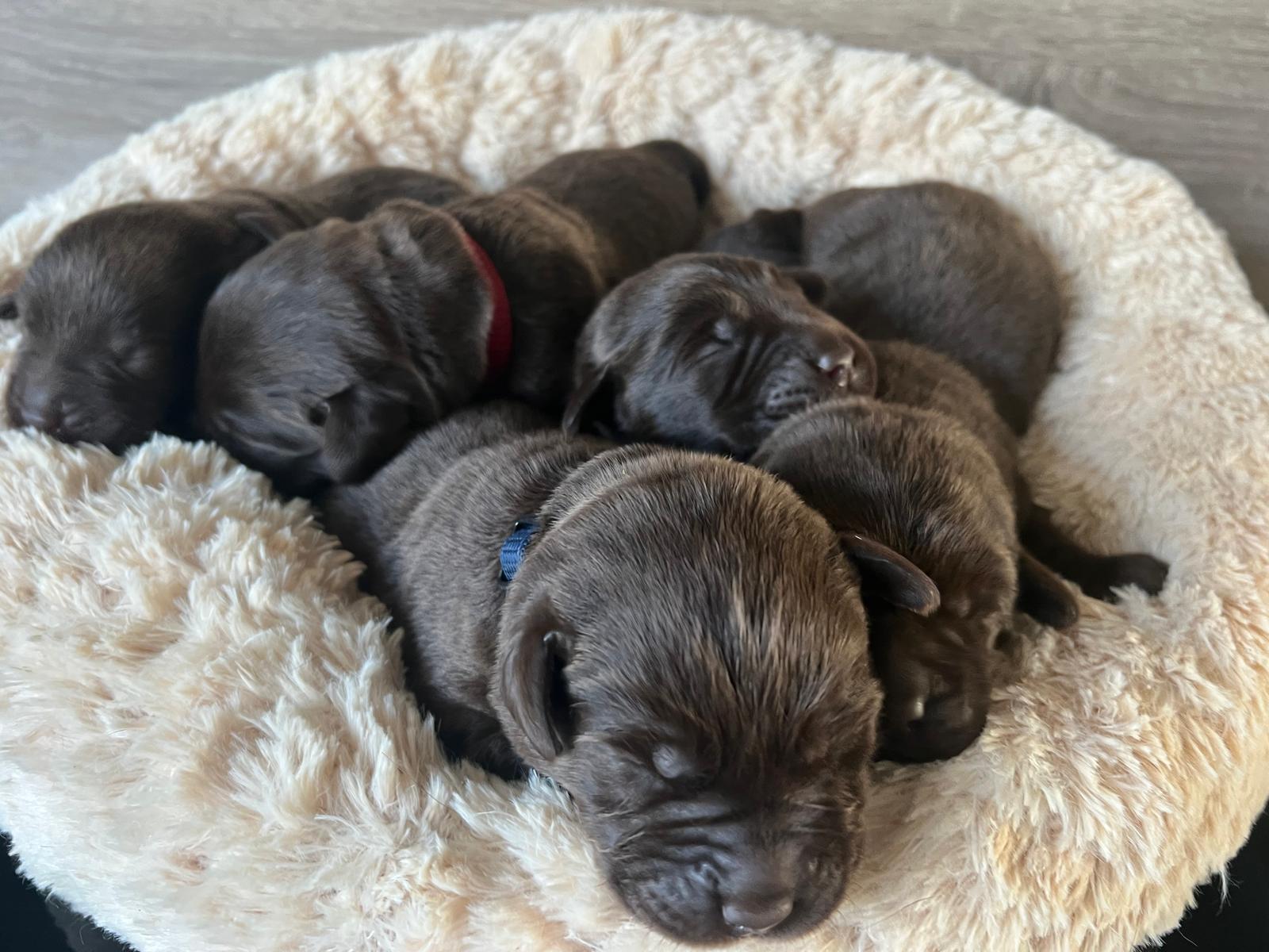 En daar zijn ze dan, de wondertjes van Gentle en Mats, het zijn 4 reutjes en 1 teefje en helaas 1 sterretje (dat was ook een teefje, maar wilde helaas niet op gang komen). De eerste reu is om 14.50 geboren, de tweede reu om 17.28 uur, de derde om 19.00, de vierde was een teefje en die is om 19.45 uur geboren, daarna kwam nummer 5 om 20.45 uur, dit was het teefje wat een sterretje is geworden en daarna nummer 6 een reutje om 21.20 uur.